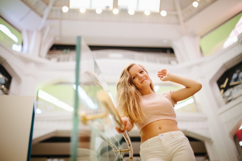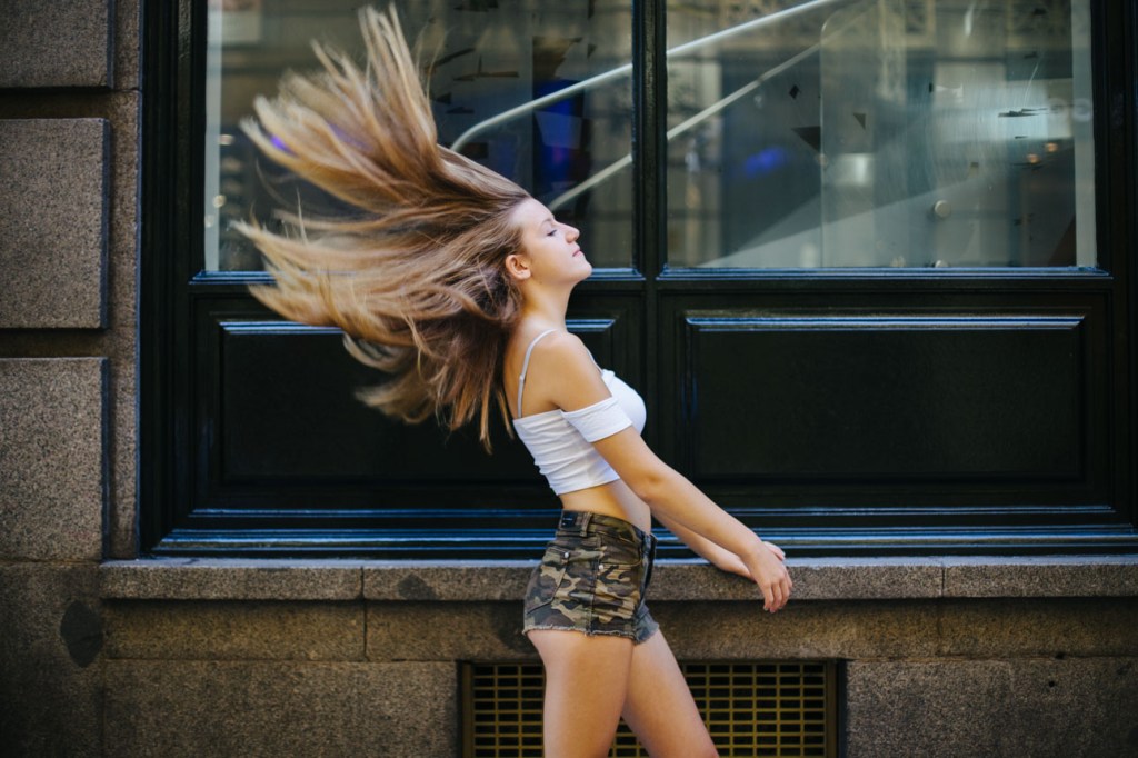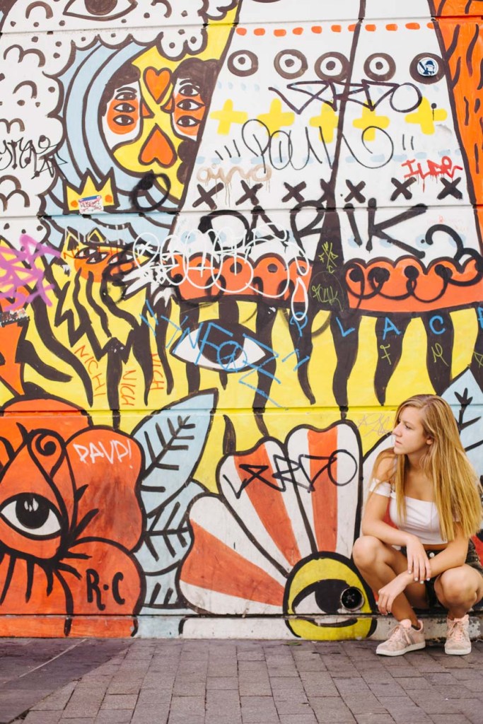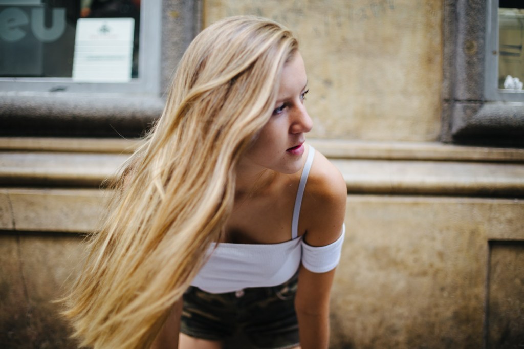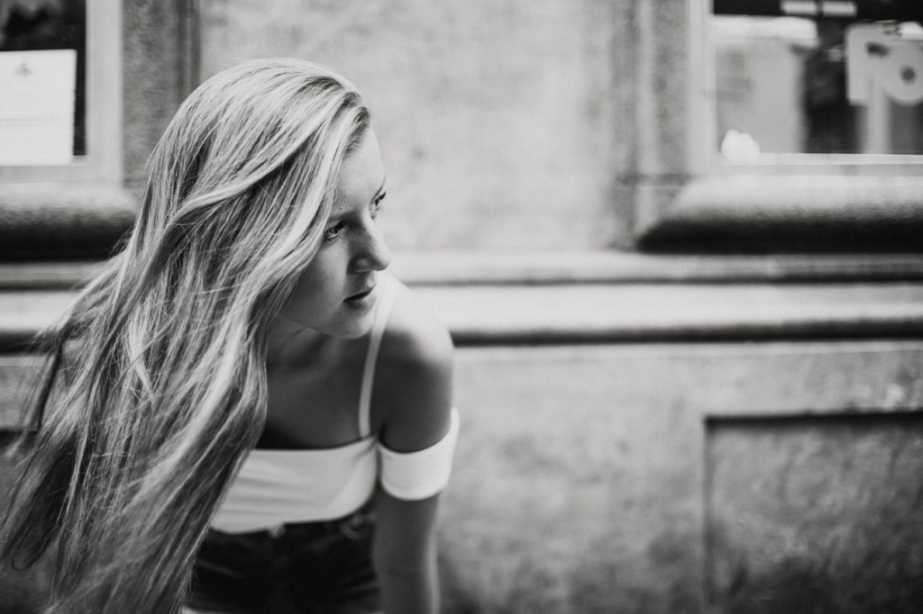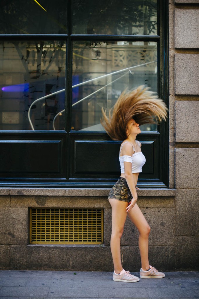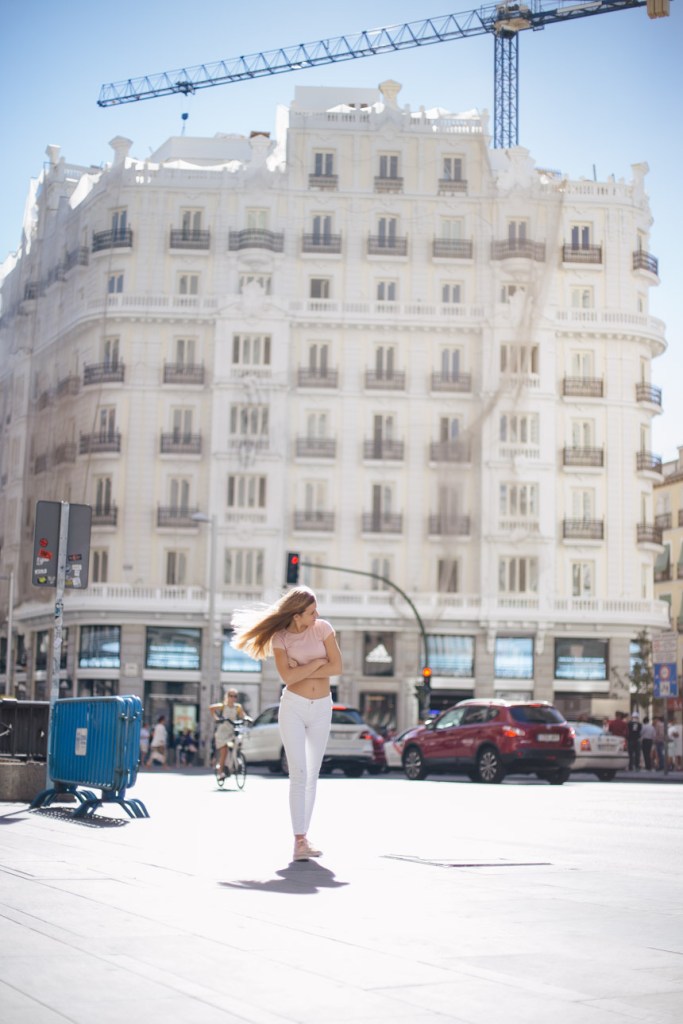 Decidimos salir las tres (siempre acompañados de uno de sus padres, claro) a afotarla por el centro de Madrid. Fuimos paseando por una de las calles que más le gusta patear, Fuencarral, y bajando hasta la Gran vía, haciendo Street Photography sin miedo ni vergüenza. Al principio sé que pensó que yo estaba muy loca cuando me miraba tirarme por el suelo, o no ver ninguna fotografía imposible, pero en seguida entró en el rollo, y me hizo de modelo experta. Yo filmaba mucho, por eso se me fue tanto la olla, porque daba igual qué le pidiera que hiciera, que lo hacía genial. Y si no le pedía, lo hacía aún mejor, así es que…