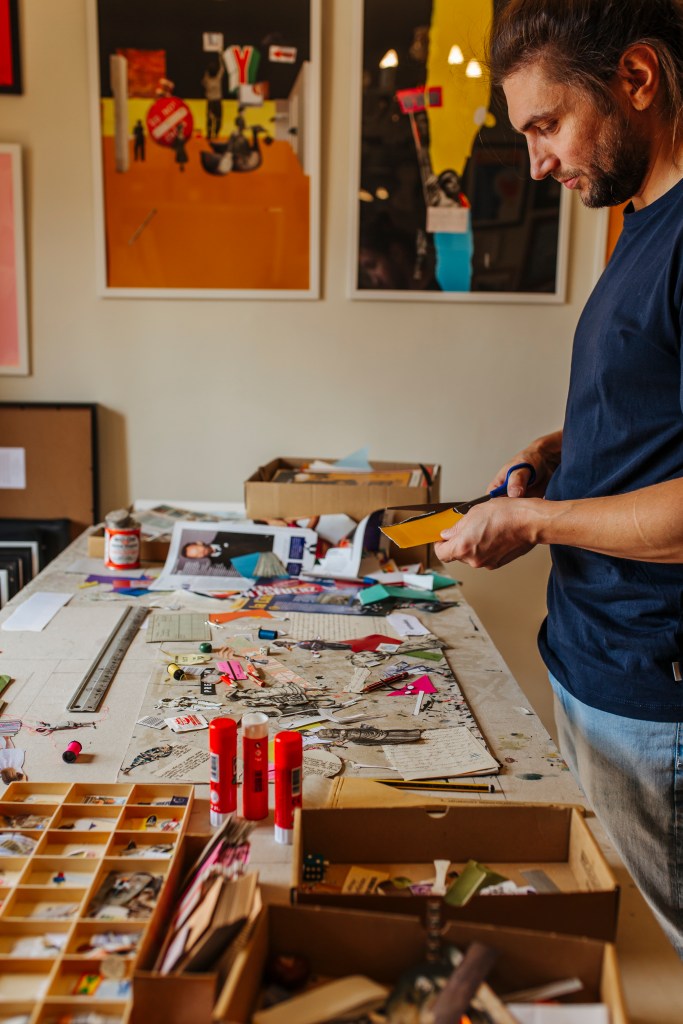 Juntos tuvieron la idea de crear un libro de collage mezclado con la literatura, y querían unas fotos para ilustrar el proceso de creación. Ahí entro yo. Hemos trabajado con muchos libros juntos, pero este momento tan de piel me hizo especial ilusión. En el Escorial, en el estudio del artista, fui muy feliz observando y agotando detalles, momentos, formas, luces y retazos de toda una vida de autor, de una mente brillante.